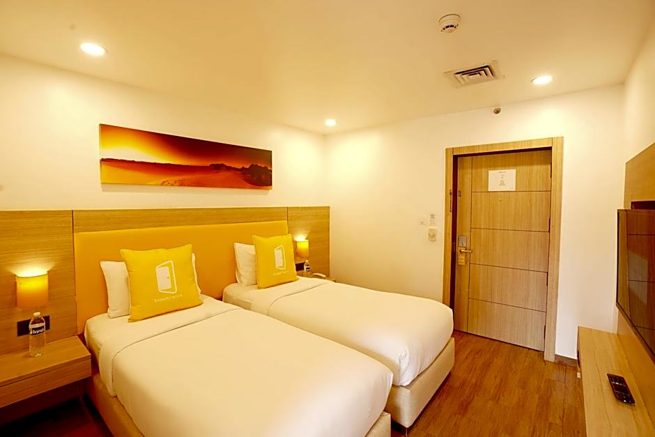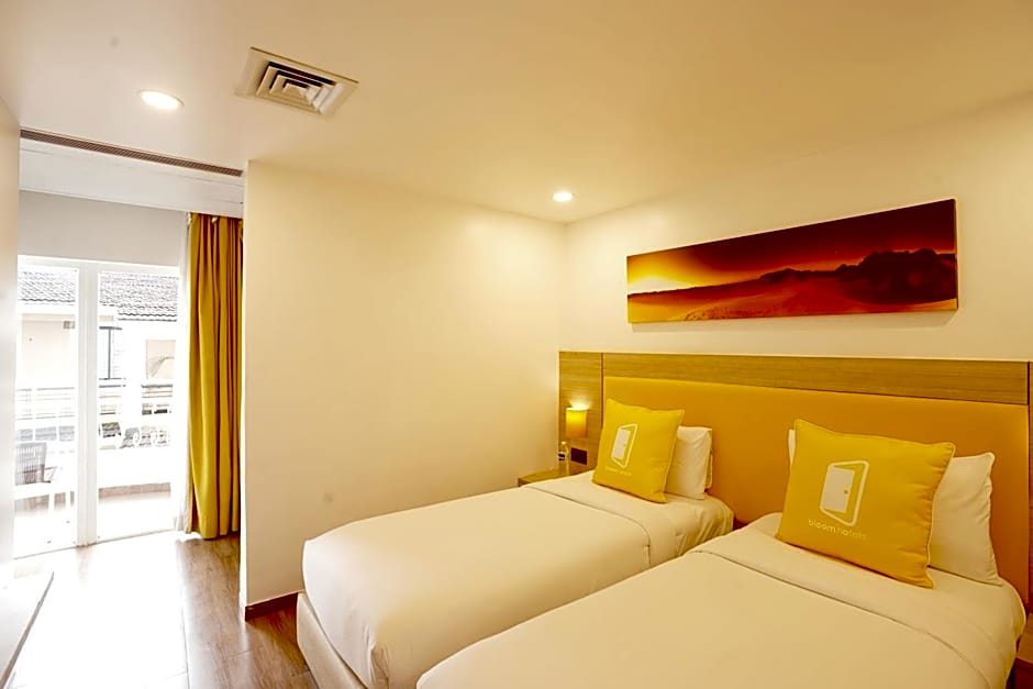 This twin bedded room has a balcony, mini fridge, digital safe and tea/coffee maker.